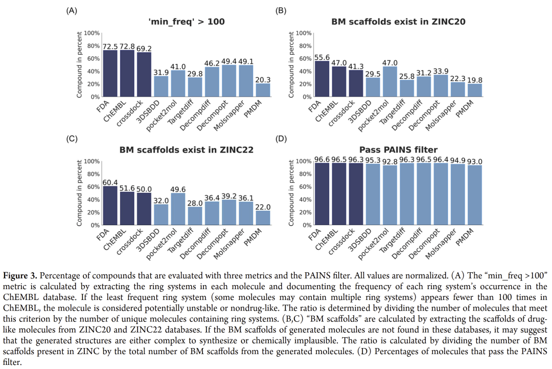结果表明,生成分子的药物样性普遍低于对照组。通过引入三个指标(ChEMBL 环系统出现频率、ZINC20 与 ZINC22 骨架匹配率),发现超过一半的生成分子未能通过任何一个标准。