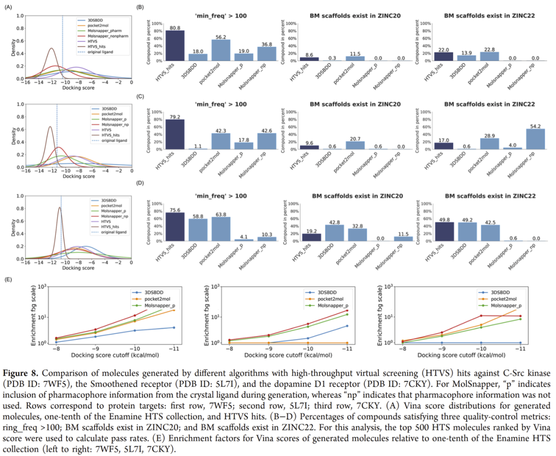 研究人员选取了三个典型靶点(C-Src、Smoothened、D1 受体),比较生成模型与 HTVS 在对接得分与化学合理性上的表现。结果显示:
