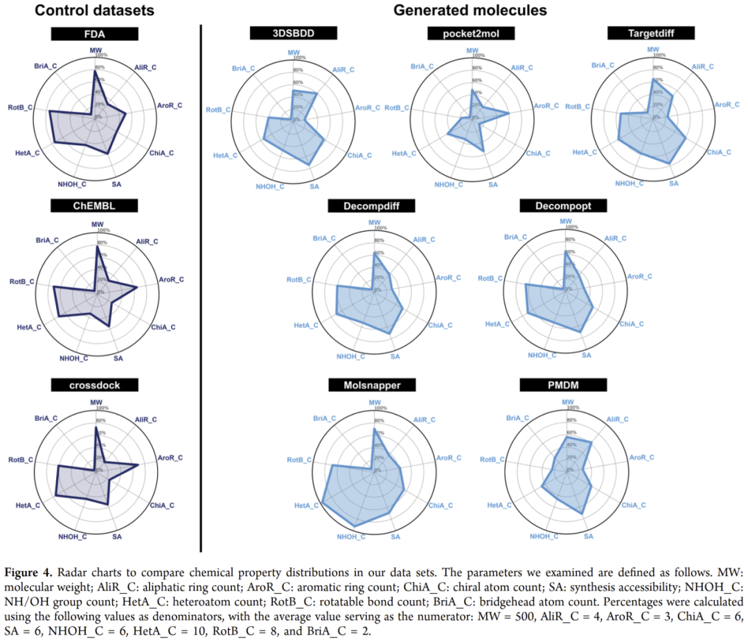 研究人员进一步分析了生成分子的理化性质分布(分子量、环数、手性原子、可旋转键等),并绘制雷达图进行比较。