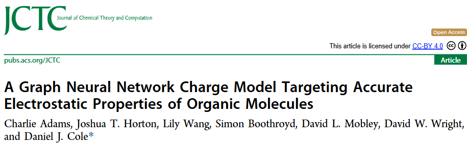 Adams, Charlie, Joshua T. Horton, Lily Wang, Simon Boothroyd, David L. Mobley, David W. Wright, and Daniel J. Cole. "A graph neural network charge model targeting accurate electrostatic properties of organic molecules." Journal of Chemical Theory and Computation (2025).