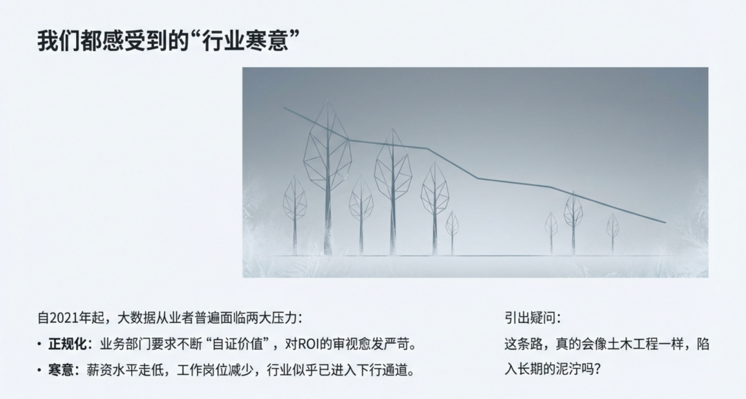 过去十年,我们把数据当成 “数字档案”。我们清扫它、存储它、膜拜它,然后卑微地祈求业务方在那堆尘封的数字里发现一丝价值。这种“伺候数据”的模式,在经济下行、效率至上的今天,必然会迎来寒冬。