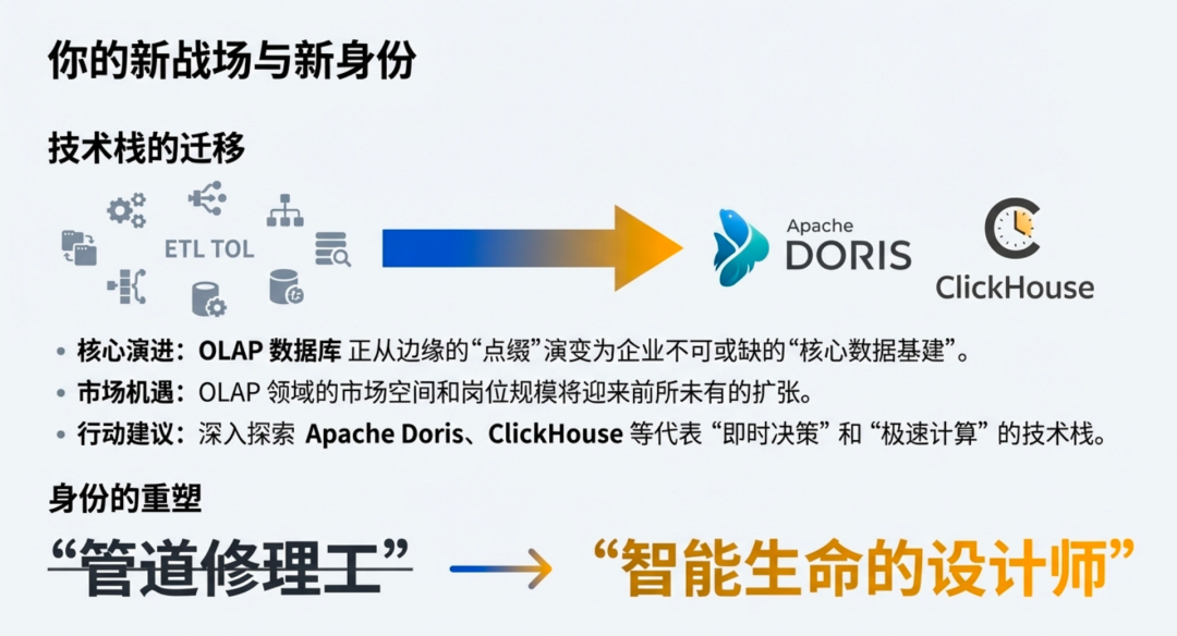 所以,我强烈建议那些准备在这一行继续深耕、继续卷下去的同学们,不要只盯着传统的离线 ETL,去更多地探索 OLAP 的实践与应用。无论是 Apache Doris( 必须首选 ^v^) 还是 Apache Doris(次选也要是 ^v^),这些代表着“即时决策”和“极速计算”的技术栈,才是你未来在 AI 时代保值增值的核心利器。