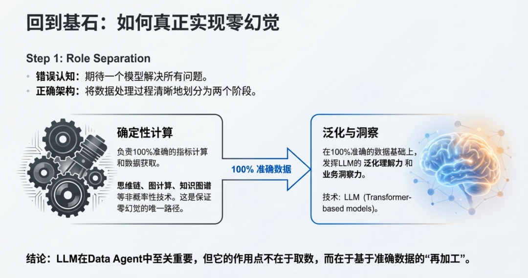 这里不是讲LLM在 Data Agent 中没有作用,而是它的作用点不在这里,它真正的作用点是泛化理解力、基于零幻觉数据的业务洞察力,两者互相不矛盾,反而应该是更精密结合的状态才对。