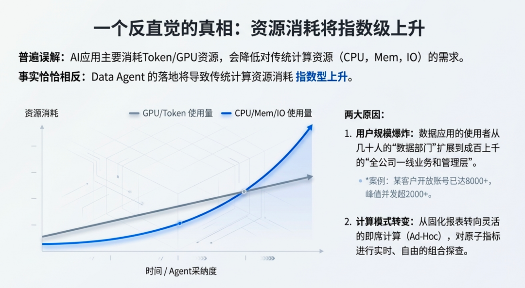 其实恰恰相反,随着 Data Agent 的落地和发展,传统计算机资源的消耗,也会指数型上升,原因有两个: