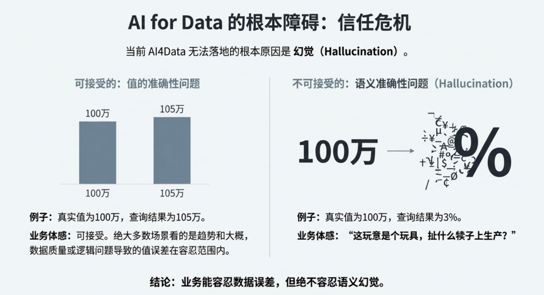 但幻觉误差,业务部门只会觉得自己在用一个类GPT的大模型玩具,而数据讲究的就是要准确,不是似是而非。