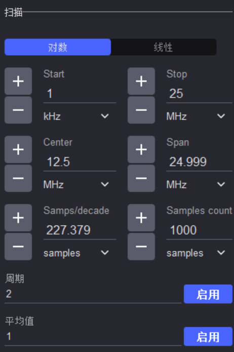 对数扫:每 decade 固定点数,比如 10 Hz → 100 Hz → 1 kHz → 10 kHz…
