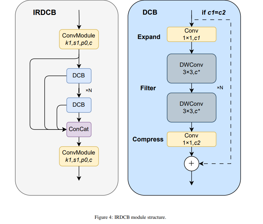 IRDCB 模块通过结合深度可分离卷积和通道重排列的高效架构来重构特征融合,在保持特征表示质量的同时显著降低了计算成本。基于 MobileNetV2 的倒残差结构 [20],我们的模块设计专门针对目标检测中的多尺度特征需求。