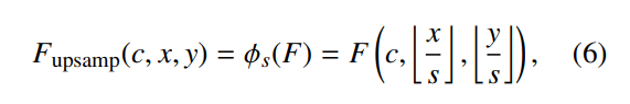 如公式 (6) 所示。对于一个输入特征图 F ∈ RC×H×W,上采样输出 ϕs(F) ∈ RC×sH×sW 通过将 F 中的每个像素 (c, i, j) 复制到输出中的一个 s × s 块来计算。
