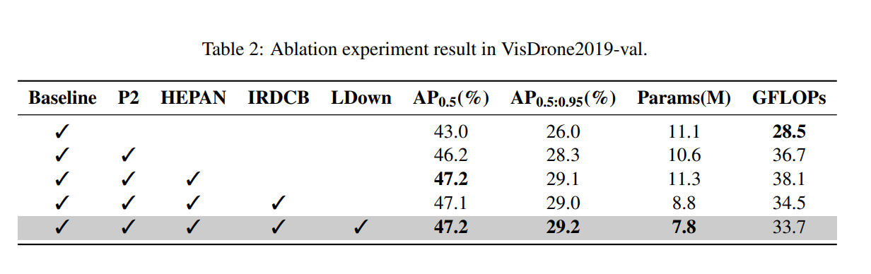 我们的实验系统地评估了四个关键组件:(1) P2 层小目标检测头,(2) HEPAN 架构,(3) IRDCB 模块,和 (4) LDown 下采样。