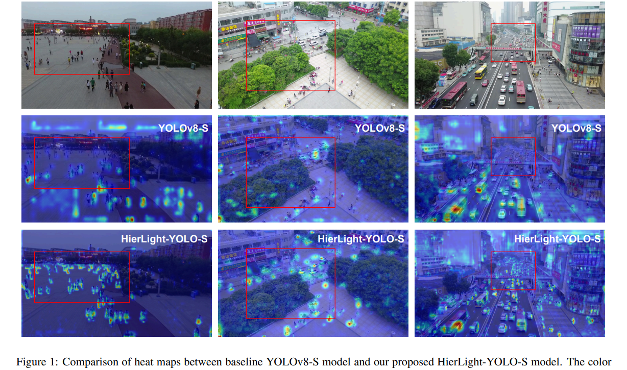 通过在 VisDrone2019 基准数据集 [27] 上的全面评估,我们提出的 HierLight-YOLO 模型在多项指标上均展现出相对于基线 YOLOv8 模型的显著改进。所提出的架构在小目标(<32×32 像素)的平均精度(AP)上实现了 3.3% 的提升,同时在 NVIDIA RTX 6000 Ada 上保持了 133 FPS 的实时处理速度。如图 1 所示,我们模型的类别激活热力图揭示了两大关键优势:(1) 集中于小目标上的更强热响应(与基线 YOLOv8 相比,强度值高出 3-5 倍);(2) 更精确的空间定位,表现为目标边界周围更紧凑的热力分布。这些可视化结果定量地证实了 HEPAN 的分层特征融合和改进的轻量模块有效地增强了模型在挑战性无人机场景中捕获细粒度特征的能力。