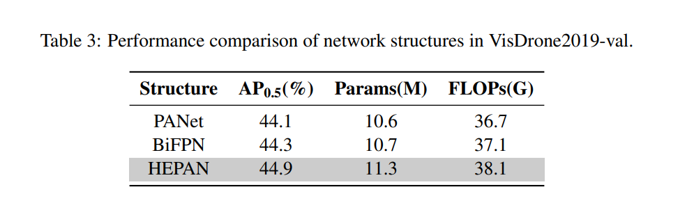 4.5. 组件级性能比较 网络结构。表 3 比较了三种网络结构(PANet、BiFPN 和 HEPAN)在 VisDrone2019-val 上的性能。HEPAN 以 1130 万参数和 38.1G FLOPs 实现了最佳检测性能(44.9% AP0.5),优于 PANet(44.1%)和 BiFPN(44.3%)。虽然 HEPAN 需要稍高的计算量,但其精度提升是显著的。