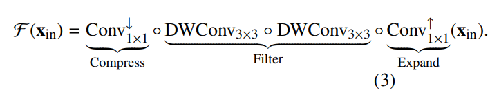 如图 4 所示,我们的 IRDCB 模块通过三个顺序阶段,对输入特征 xin 实现高效的特征变换 F,其输入/输出通道维度分别为 c1 和 c2: