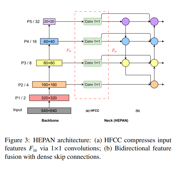 我们提出了分层扩展路径聚合网络(HEPAN)来优化小目标检测的特征融合,如图 3 所示。通过在颈部网络中引入额外的 1×1 卷积层,HEPAN 增强了特征提取和表示能力,同时包含了密集的残差连接以提高梯度流稳定性。与传统的 PANet 和 BiFPN 结构相比,HEPAN 通过更精细的特征连接和高效的信息流,实现了更优异的检测精度,尤其是在复杂背景中的小目标检测方面。