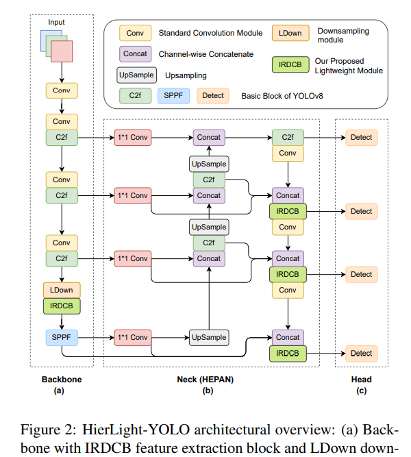 在本节中,我们将详细介绍我们 HierLight-YOLO 模型的网络设计。我们的目标是提升 YOLOv8 模型的检测性能,特别是在无人机影像中小目标检测这一具有挑战性的任务上。我们通过着重优化多尺度特征融合机制和引入轻量级模块来增强小目标检测能力。这些创新使得模型能够在复杂和杂乱的背景中保持出色准确性的同时,捕获小目标的关键特征信息。在以下小节中,我们将介绍这些增强功能的核心方面,并探讨其详细实现。我们增强网络的整体结构如图 2 所示。它由三个主要部分组成:骨干网络、颈部网络和检测头。骨干网络包括标准卷积、C2f 和我们轻量级的 IRDCB 模块,负责特征提取和压缩。颈部网络使用 HEPAN 来融合多尺度特征,增强小目标检测。检测头包含四个不同尺度的检测层,以确保模型能够准确识别多尺度目标。