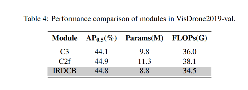 模块。表 4 比较了 C3、C2f 和 IRDCB 模块。IRDCB 显著减少了参数至 880 万(比 C2f 模块少 22.1%)和 FLOPs 至 34.5G(比 C2f 模块少 9.4%),精度为 44.8% AP0.5,仅比 C2f 模块低 0.1%,展示了性能与效率之间的良好平衡。