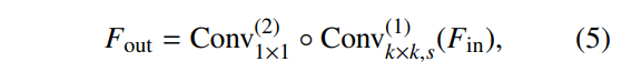 如公式 (5) 所示。其中 Fin 是输入特征,Fout 是输出特征。第一层 Conv(1)k×k,s 应用一个 k×k 卷积,步长为 s,组大小 g = c1(相当于深度卷积)。通过步长 s,k×k 核降低了输入特征图的空间分辨率(例如,H × W → ⌊H/s⌋ × ⌊W/s⌋),使模型能够以较低的计算成本捕获更粗粒度的上下文信息。第二层 Conv(2)1×1 跟随一个 1×1 卷积,将通道维度从 c1 变换到 c2。1×1 核独立地在每个空间位置上操作,混合通道信息而不改变空间分辨率。其较低的计算复杂度确保了后续层处理更少但信息更丰富的特征。