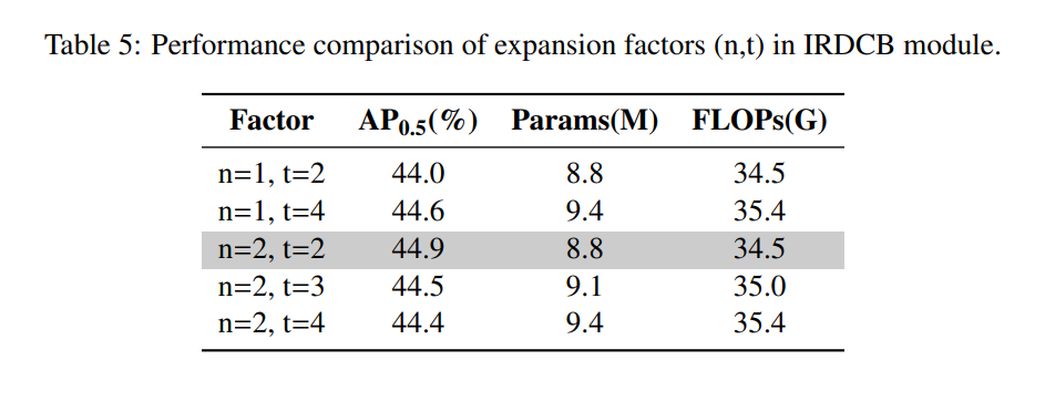 扩展因子。表 5 显示了具有不同扩展因子的模型性能比较。可以观察到,扩展因子组合 n=2, t=2 以 880 万参数、34.5G FLOPs 实现了最佳性能 44.9% AP0.5,优于所有其他因子。将 t 从 2 增加到 4(固定 n=1)带来的回报递减(AP 增加 0.6% 但参数增加 6.8%)。值得注意的是,对于 n=2,将 t 从 2 增加到 4 会导致性能下降并伴随参数增加,表明过度扩展会破坏模型优化。