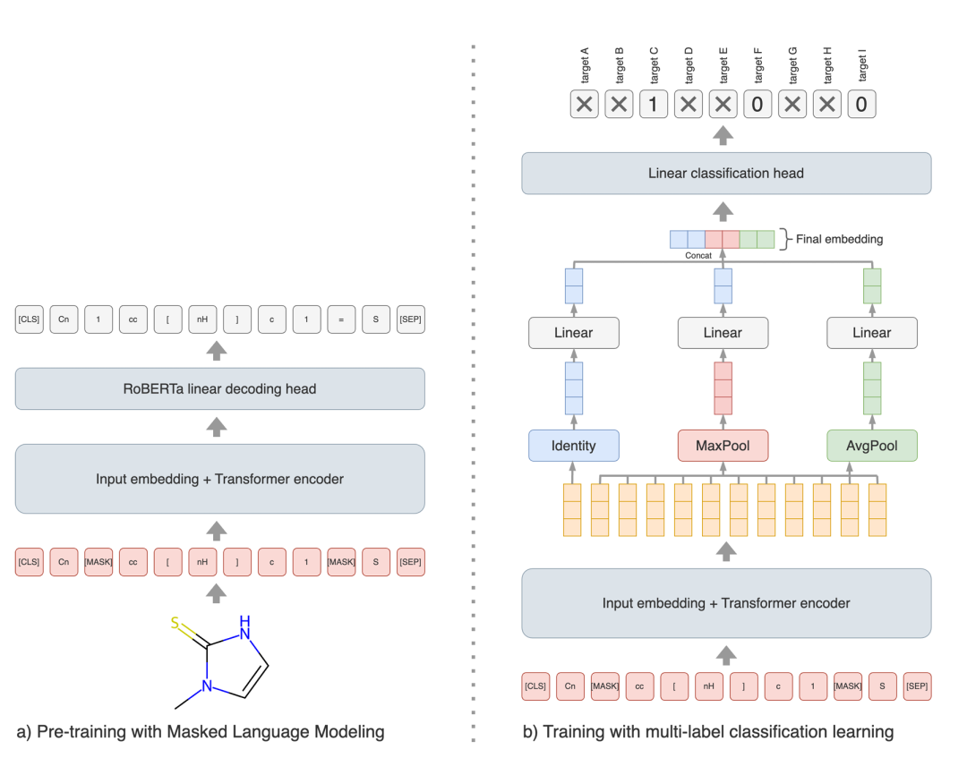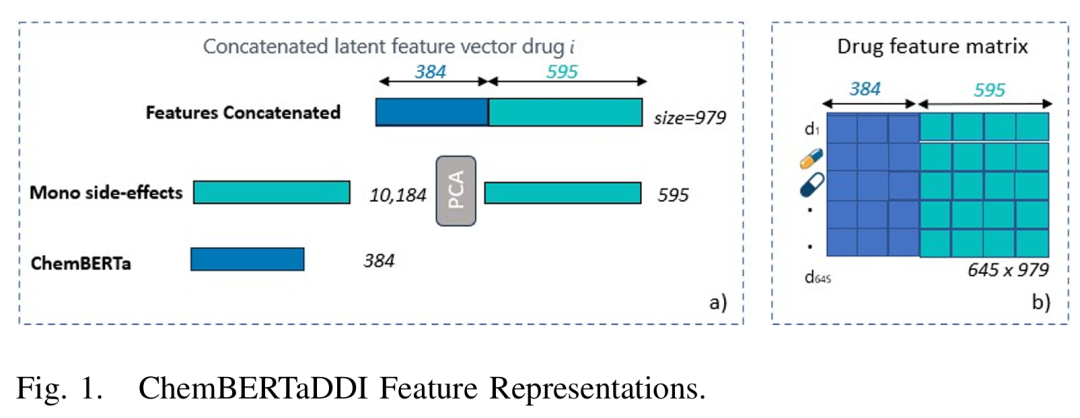 简介: 论文提出 ChemBERTaDDI 框架,通过将大型自监督语言模型 ChemBERTa-77M-MLM 生成的 384 维 SMILES 表征与 10184 维单药不良反应(mono side effects)经 PCA 降维后的 595 维临床特征拼接,构建 979 维多模态药物向量。对于每一对药物,作者采用元素级求和得到组合表示,再输入三层全连接网络完成 964 类多重不良反应的二分类预测。该方法在训练阶段仅微调预测器,保留 ChemBERTa 权重冻结,因而在捕获分子结构语义的同时避免额外计算开销。