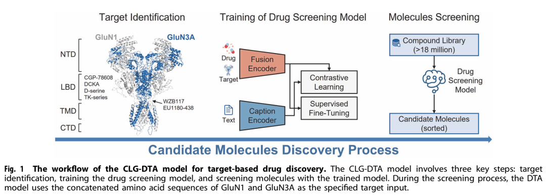 简介: 论文提出了 CLG-DTA,一种融合图对比学习与自然语言监督的新型药物-靶点亲和力预测框架,用于加速 GluN1/GluN3A 受体小分子筛选。模型包含药物图、蛋白质序列、亲和力文本三种模态的六个编码器,并将实验亲和力数值转写成英文词串,再借助共识数值知识图谱对连续文本嵌入施加顺序约束,从而获得判别性更强的分布式表示。在 Davis 与 KIBA 两个基准数据集上,作者设置四种冷启动情景 (S2–S4) 验证泛化能力;CLG-DTA 在多数场景的 PCC、MSE 等指标上优于 SVM、RF、MSGNN-DTA 和 HGRL-DTA 等方法,例如在 KIBA 的 “新药-新靶” 场景中 PCC 提升至 0.280,相比次优基线提高约 140%。消融实验显示,对比学习和 0.01 精度的数值文本化是性能提升的关键。 作者进一步将模型迁移到 BindingDB 中 3726 条 GPCR 亲和力数据,CLG-DTA 取得 MSE 1.148、PCC 0.734,显著优于最强对比 MSGNN-DTA (MSE 1.640、PCC 0.537)。在实际筛选中,模型对 1800 万化合物虚拟筛选后选出 12 个候选体,细胞水平验证发现 5 个活性化合物 (命中率 41.7%),其中 Boeravinone E 的 IC₅₀ 为 3.40 ± 0.91 μM,经膜片钳实验和分子对接确认其可能结合于 GluN1-GluN3A NTD 与 LBD 交界处。 总体而言,CLG-DTA 通过将数值亲和力语言化并与图结构特征对齐,实现了对陌生化学-生物空间的稳健外推,并在实验层面发现了新的 GluN1/GluN3A 抑制剂,为针对神经疾病的 NMDA 受体药物开发提供了有效工具。