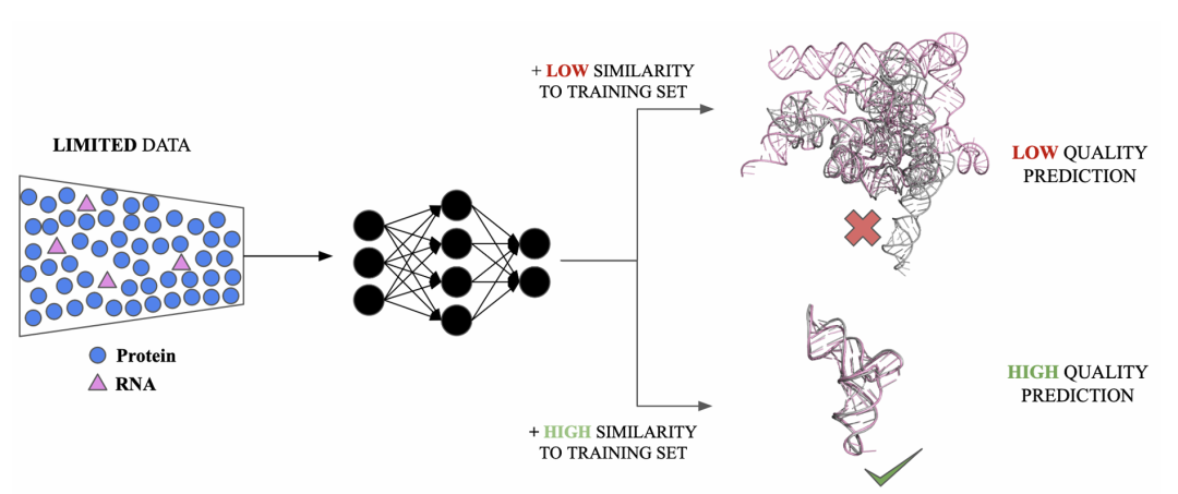 结果表明,单链任务中 Boltz-1 取得平均 TM-score 0.512、成功率 53%,略优于 AlphaFold3 的 0.483 / 42%;复合体预测则以 AlphaFold3 表现最佳(TM-score 0.642、DockQ 0.395),Boltz-1 次之。进一步分析显示,模型性能与目标在训练集中的最大 TM-score 呈显著正相关,说明现有算法主要靠识别已见过的螺旋或三叶草等常见模体,而对新折叠的泛化能力有限;约三分之一的样本可获得高精度模型,若结构与训练数据相似度低于 0.25,平均 TM-score 降至 0.1 以下。此外,单链 RNA 的 pTM 置信度与实际 TM-score 相关性弱,ipTM 对识别复合体正确接口更具参考价值。作者指出,当前深度学习模型在 RNA 结构预测上仍受限于训练数据稀缺与准确度评估失真,未来需扩大多样化实验结构、改进模型不确定性量化,才能真正突破复杂或未知 RNA 构象预测的瓶颈。
