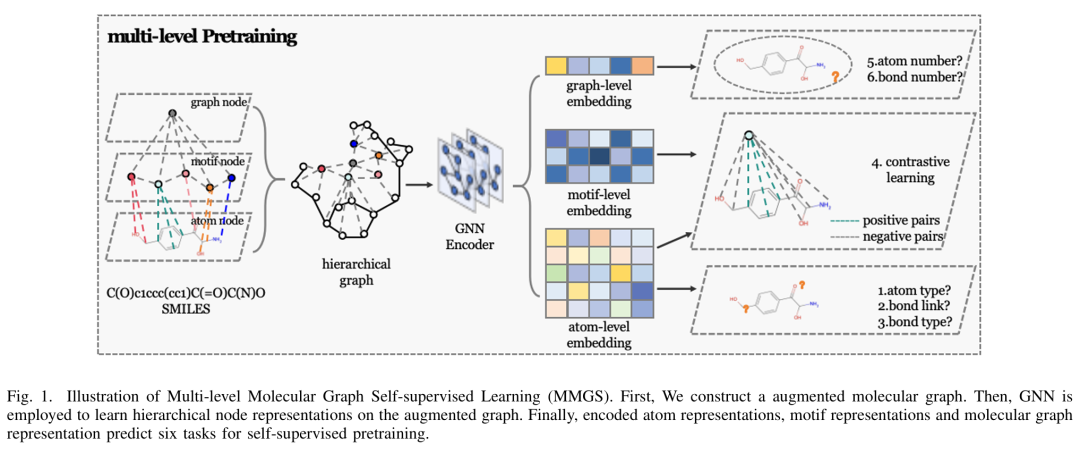 简介: 本文针对分子性质预测中对多尺度化学结构难以同时建模的问题,提出了 MMGSF 框架。该框架首先在预训练阶段构建含原子、功能团(motif)及全图三类节点的分层分子图,并设计六个自监督任务:原子类型、键连通性与键类型生成,motif-atom 对比学习,以及原子数目和键数目预测,从而让 GNN 同时捕获局部到全局的化学语义信息。随后,在微调阶段引入 Multi-Grain Finetuning (MGF),分别利用均值池化、注意力池化和 MLP 得到原子粒、motif 粒及图粒表示,并通过可学习查询向量驱动的跨粒度注意力(mol-adapter)自适应融合,充分保留互补特征并抑制冗余。整体方法无需额外参数即可在训练过程中动态调节不同粒度信息的权重,从而构建更具判别力的分子表示。