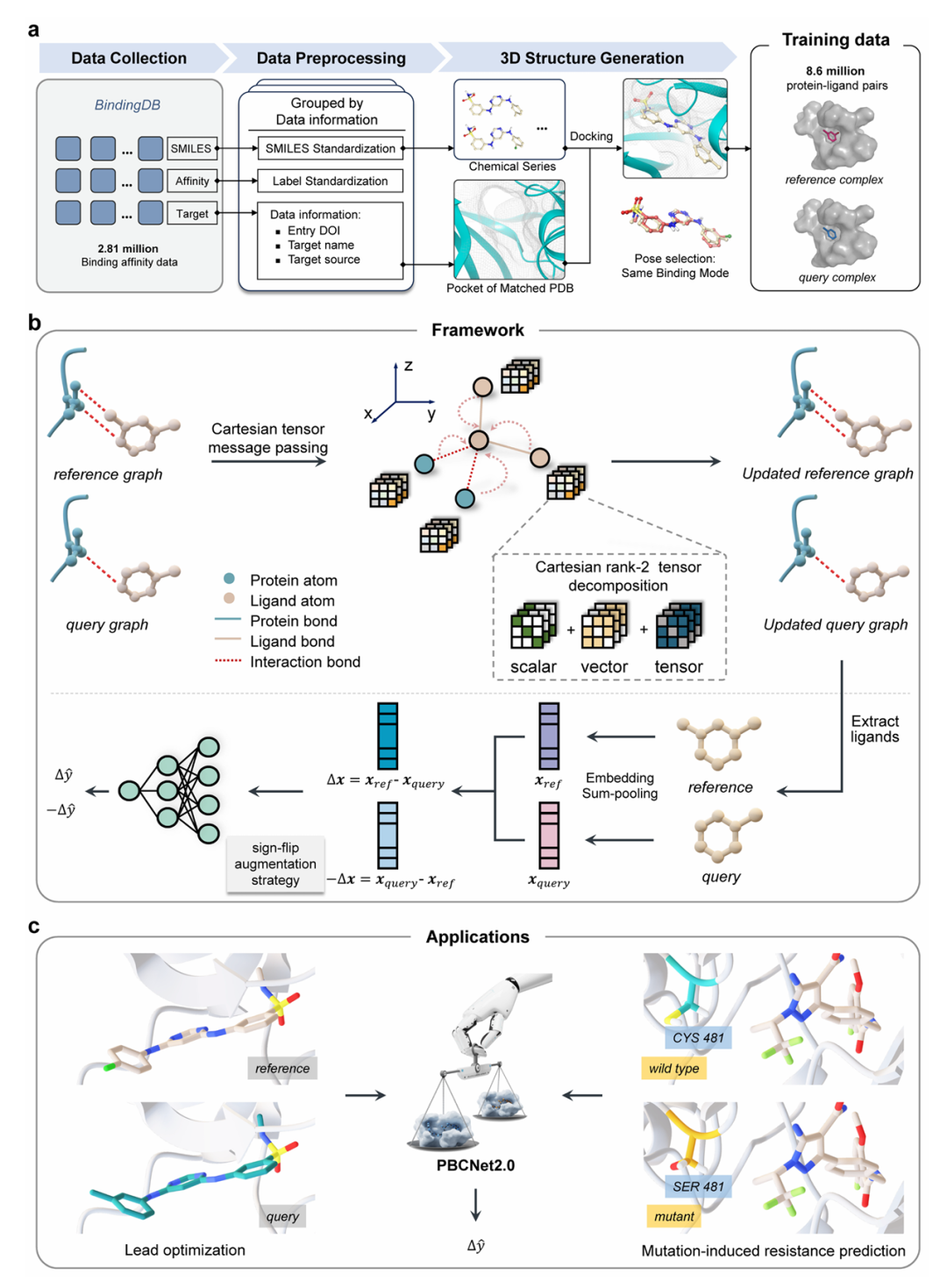 简介: 论文提出了 PBCNet2.0,一种基于笛卡尔张量的等变图神经网络式成对比较架构,用于预测蛋白-配体相对结合亲和力。作者将训练集规模从前代的 60 万扩展到 860 万 BindingDB 复合物对,并在消息传递层引入 rank-2 笛卡尔张量,使模型能在不依赖预设势函数的情况下直接学习距离与角度信息,从而更精细地捕获蛋白-配体相互作用。在 16 个化学系列组成的 FEP 公开基准上,PBCNet2.0 的零样本 Spearman 相关系数达 0.67,逼近工业金标准 Schrödinger FEP+ 的 0.70,并显著超越 PIGNet2、RTMScore 等 10 种 AI 基线;少量 SAR 数据微调后,其排名精度进一步反超 FEP+,在 8 个真实项目回顾测试中将活性优化效率提升约 7 倍,同时节省近 40 % 资源。