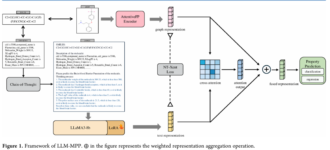简介: 作者提出了 LLM-MPP,一种面向药物分子性质预测的新型多模态框架。该方法同时利用 1D SMILES、2D 分子图和从 PubChem 提取的性质文本描述,通过 LoRA 微调的 LLaMA3-8b 生成链式思考(CoT)推理文本,以提升可解释性和跨模态对齐能力。模型以 AttentiveFP 提取图表示,再借助多头交叉注意力与加权融合将文本与图特征整合,并辅以温度化对比学习约束,使不同模态共享一致的潜在空间,从而获得信息丰富且鲁棒的分子表示。