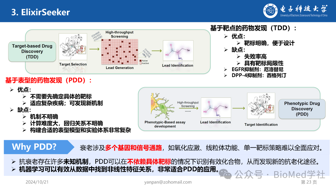 在这里,PDD的一个典型例子是电子科技大学医学院和北京市疾控中心毒理所的团队在bioRxiv上发表的赛博神农——ElixirSeeker模型[2]。这一研究展示了机器学习在表型药物发现中的潜力,特别是在抗衰老药物的开发方面。