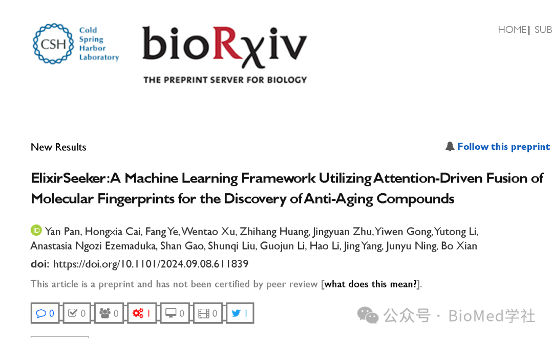 [2] Yan Pan; Hongxia Cai; Fang Ye; Wentao Xu; Zhihang Huang; Jingyuan Zhu; Yiwen Gong; Yutong Li; Anastasia Ngozi Ezemaduka; Shan Gao; Shunqi Liu; Guojun Li; Hao Li; Jing Yang; Junyu Ning; Bo Xian. ElixirSeeker: A Machine Learning Framework Utilizing Attention-Driven Fusion of Molecular Fingerprints for the Discovery of Anti-Aging Compounds. bioRxiv 2024 .