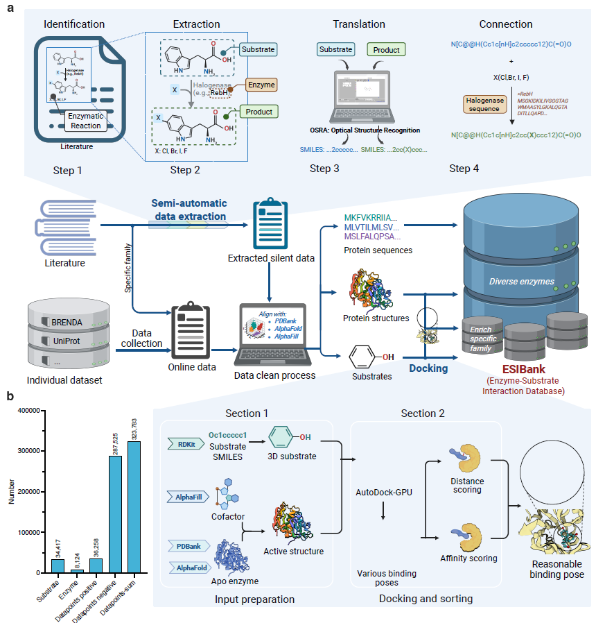 为训练模型,研究人员建立了涵盖 32 万余条记录的 ESIbank(Enzyme–Substrate Interaction Bank)。该数据库融合序列、结构及反应信息,是迄今规模最大、分辨率最高的酶–底物复合物资源。