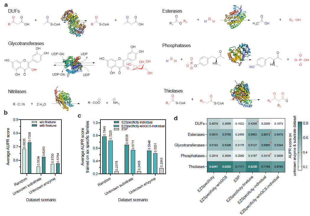 研究人员进一步在六个典型酶家族(如水解酶、糖基转移酶、硫解酶等)中测试模型泛化性。EZSpecificity 在未知底物与未知酶场景下依旧保持高性能(平均 AUPR 达 0.68)。