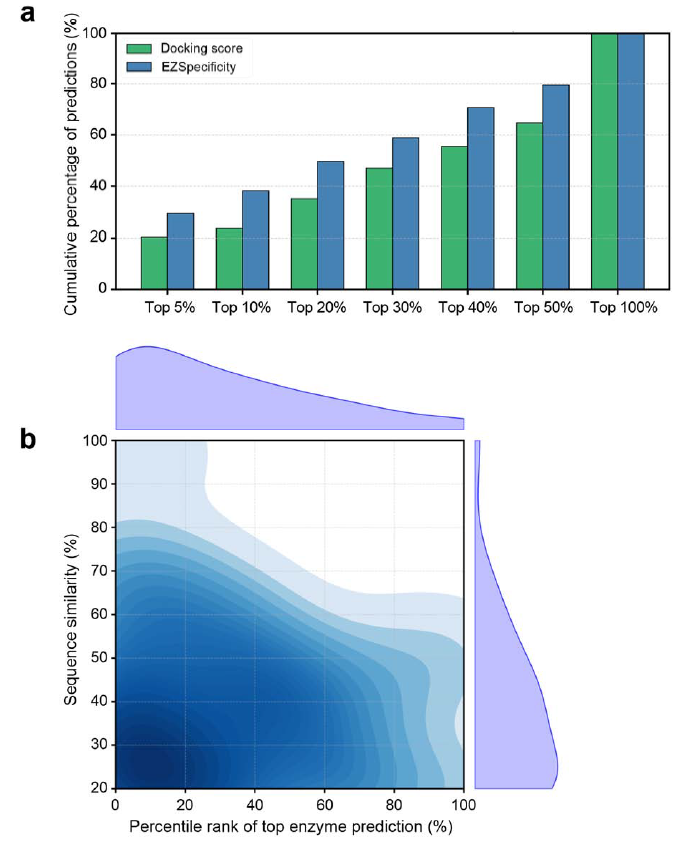 在大肠杆菌代谢网络(34 种代谢物、860 种酶)的测试中,EZSpecificity 在前 5% 排名中正确识别率达 29.4%,优于传统对接打分(20.4%)。模型在低序列相似性条件下仍保持较高准确率,展示了对未知序列的泛化能力。