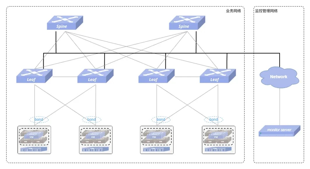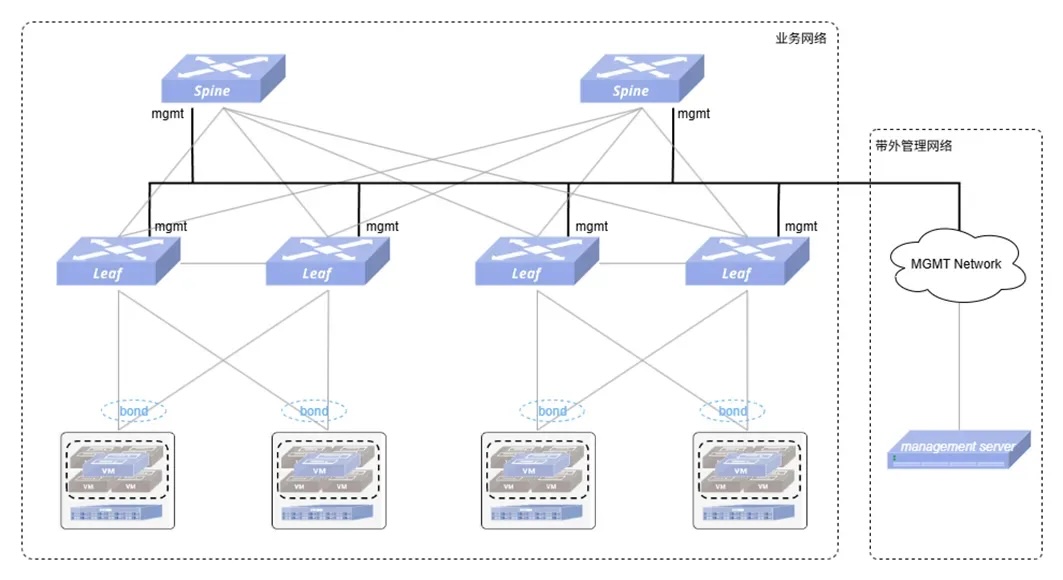 NETCONF:基于SSH协议,提供事务性配置机制与精准的数据操作能力,适用于对可靠性要求极高的电信级网络;以下是一个典型的数据中心带外管理网拓扑: