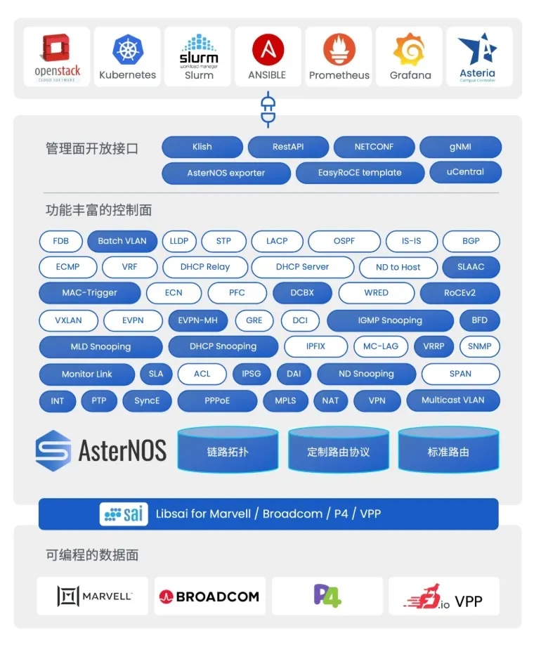 截至2025年底,运行最新版本AsterNOS的星融元交换机,包含数据中心、园区和边缘智能网关/路由产品系列,已支持新一代的基于 YANG 数据模型的运维管理接口,其中包括 NETCONF,RESTCONF(RESTful API)和 gNMI ,提供设备配置(如路由协议配置)、系统状态(如CPU负载、内存使用量、主板温度、风扇转速)以及端口转发计数、ACL命中计数、关键资源使用量在内的丰富统计信息。