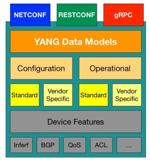设备供应商使用原生的 YANG 模型或 IETF/OpenConfig 提供的标准 YANG 模型来描述其所有配置层次结构和所有支持的功能。网络工程师若需对设备进行配置,仅需要拿到对应设备的YANG文件并按照它的定义向设备下发即可。