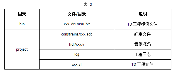 (3)案例位于产品资料“4-软件资料\Demo\FPGA-demos\FPGA-HDL-demos\”目录下。案例包含bin目录和project压缩包,其中bin目录下含有案例可执行镜像文件,project压缩包内包含案例工程文件。案例目录详细说明见下表: