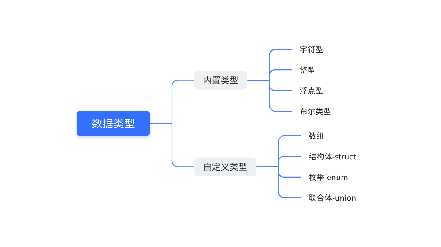 人与类聚,物与群分。C语言中,提供了丰富的数据类型来描述生活中的各种类型,所谓的类型,就是将具有相同特征的数据归类在一起。使用整型类型来描述整数,使用浮点型来描述小数,使用字符类型来描述字符。下面是数据类型的思维导图: