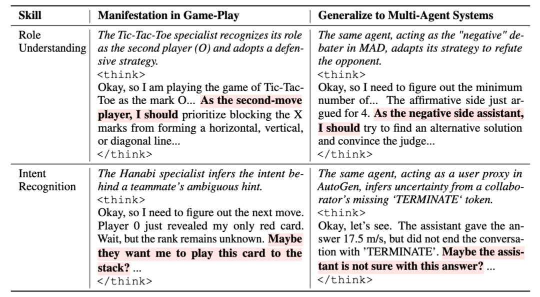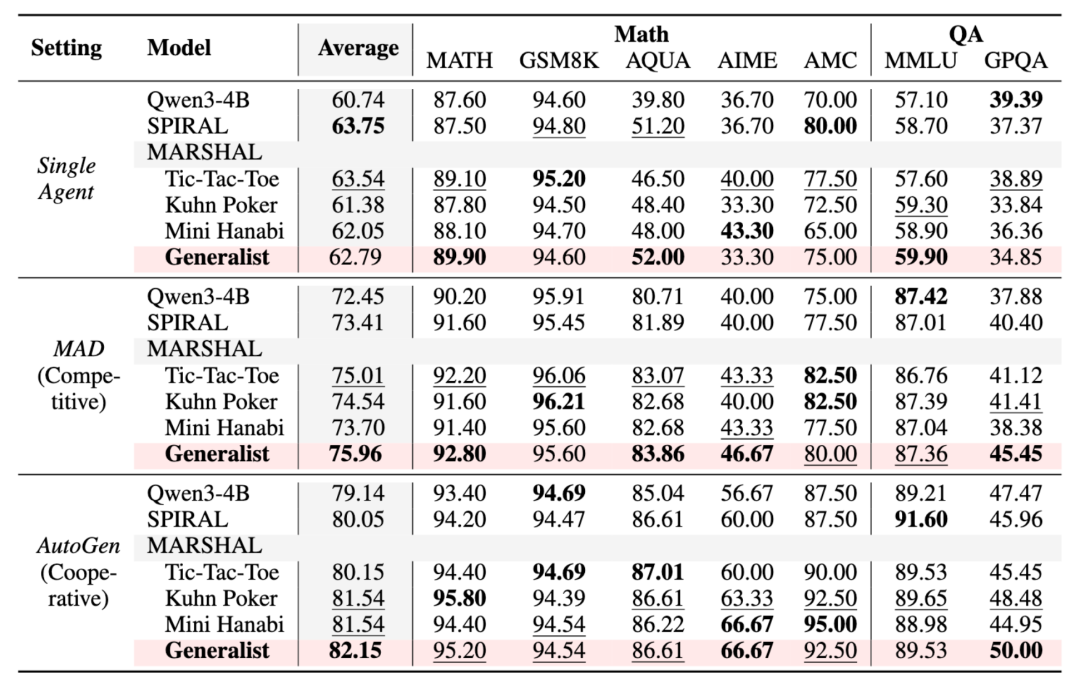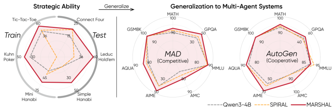 研究团队以 Qwen3-4B 为基线模型,在三款训练游戏(Tic-Tac-Toe、Kuhn Poker、Mini Hanabi)中训练了两种类型的智能体: