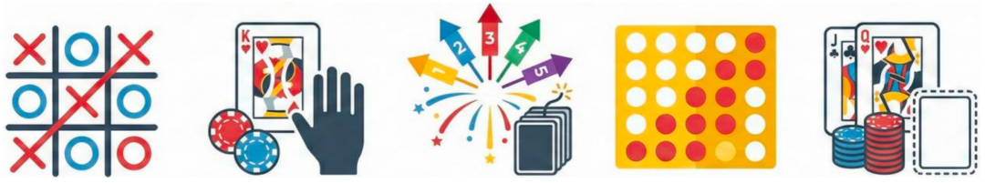 为了培养全面的多智能体推理能力,研究团队精心挑选了六款策略游戏(其中三款用于训练,另外三款用于测试),涵盖了从简单到复杂、从竞争到合作的多种博弈类型。