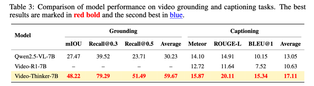 Video-Thinker 的核心假设是:强大的视频推理源于对视频内容的精准 “定位(Grounding)” 和细致 “描述(Captioning)”。为了验证这一假设,研究团队不仅评测最终答案的准确率,还专门针对这两项中间过程能力进行了定量评测。评测结果表明: