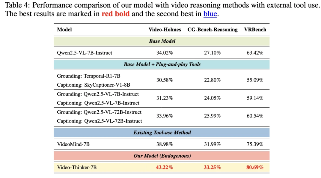 3. Video-Thinker 内生思维链的压倒性优势:最终,通过训练获得内生能力的 Video-Thinker-7B 展现了统治级的表现。它在 Video-Holmes 上取得了 43.22% 的全场最高分(红色加粗),不仅远超外挂工具方案,也显著优于 VideoMind-7B;同时在 VRBench 上更是达到了 80.69% 的高分。实验有力地证明,在视频推理任务中,将 “感知 - 定位 - 描述 - 推理” 无缝融合的内生思维链(Endogenous CoT),比简单的工具堆叠甚至 VideoMind 这种外部调用方法都更为高效可靠。
