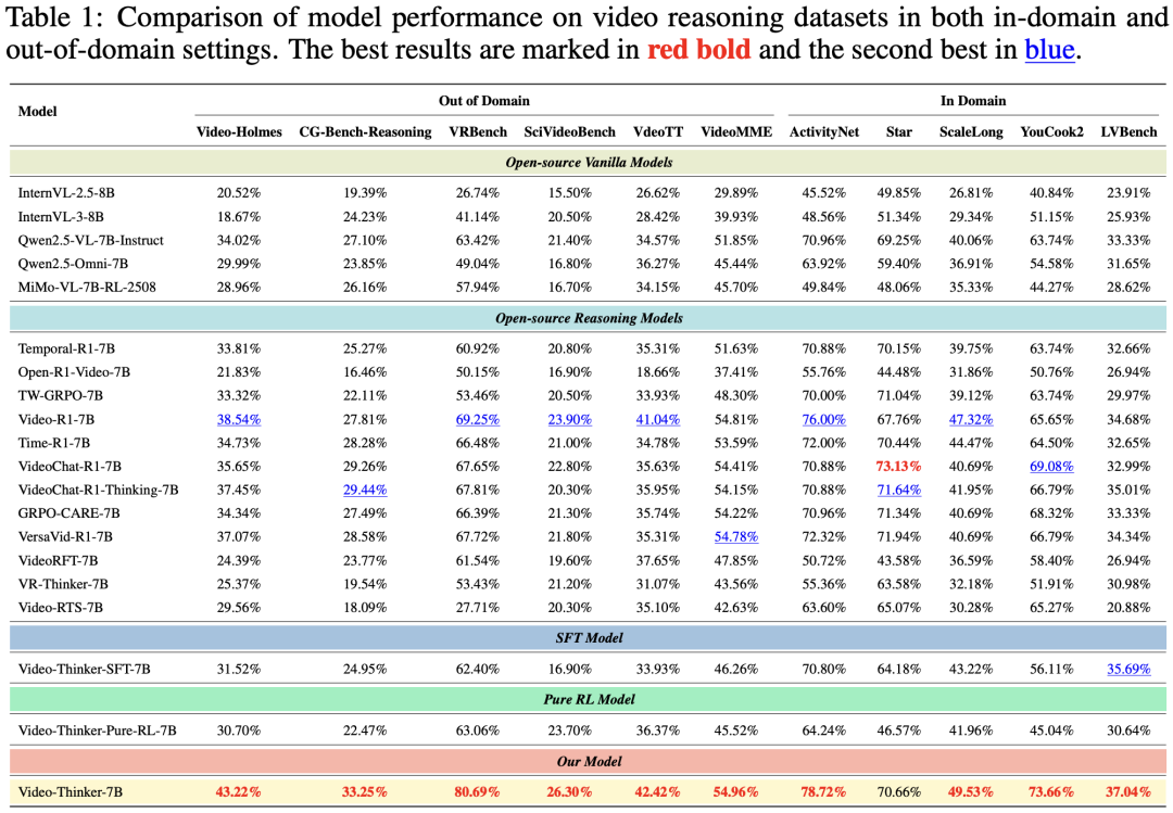 为了全方位验证 Video-Thinker 的视频推理能力,研究团队构建了包含域内(In-Domain)与域外(Out-of-Domain)的双重评估体系。