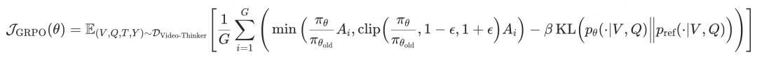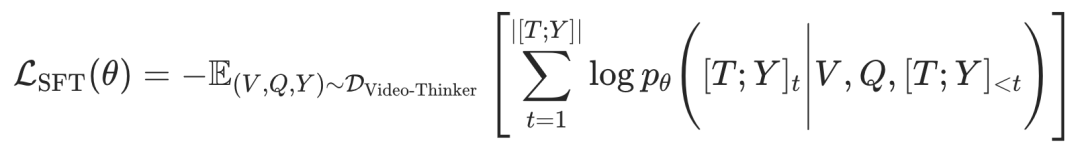 对于每一个样本 (V, Q, T, Y),其中 V 是视频,Q 是问题, T 是包含 <time>,<caption> 和 <think> 的思维链, Y 是最终答案。SFT 的优化目标是最小化思维链与答案的负对数似然: