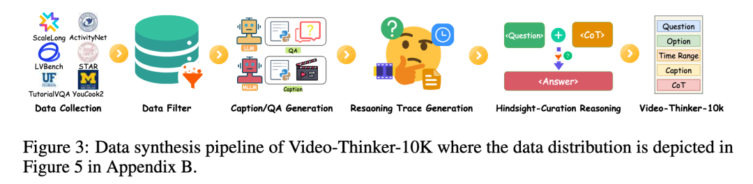 要让模型真正掌握视频场景下的复杂推理能力,构建高质量的训练数据是必经之路。然而,现有的开源视频数据集普遍存在 “二元割裂” 的结构性缺陷:一类是以 ActivityNet、YouCook2 为代表的描述型数据,虽然拥有精确的时间段标注和画面描述,但缺乏需要深度思考的逻辑问答;另一类是以 STAR、LVBench 为代表的问答型数据,虽然问题极具挑战性,却往往缺失了支撑答案的关键帧定位与视觉细节。为了弥补这一鸿沟,团队整合了六大主流数据集,构建了 Video-Thinker-10K。该数据集并未止步于简单的拼接,而是引入了一套 “后见之明(Hindsight-Curation)” 的自动化流水线,通过 “补全 - 合成 - 验证” 的严密闭环,生产出兼具精准时序定位(Grounding)与详尽视觉描述(Captioning)的结构化推理数据,确保模型在学习过程中能够建立起从视觉证据到逻辑结论的完整映射。