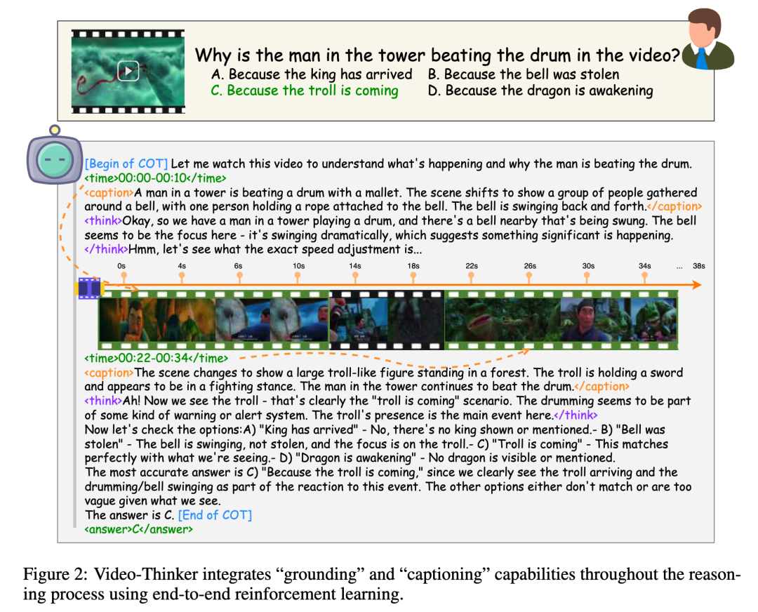 与传统方法不同,Video-Thinker 不依赖构建和调用外部工具,而是将 “时序定位(Grounding)” 与 “视觉描述(Captioning)” 这两种核心能力内化在模型的思维链(CoT)中,使其能在推理过程中自主寻找关键帧并提取视觉线索。