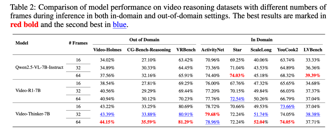 视频理解往往受限于输入帧数。为了探究 Video-Thinker 是否依赖高帧率输入,团队对比了模型在 16 帧、32 帧和 64 帧设置下的表现。实验数据表明:
