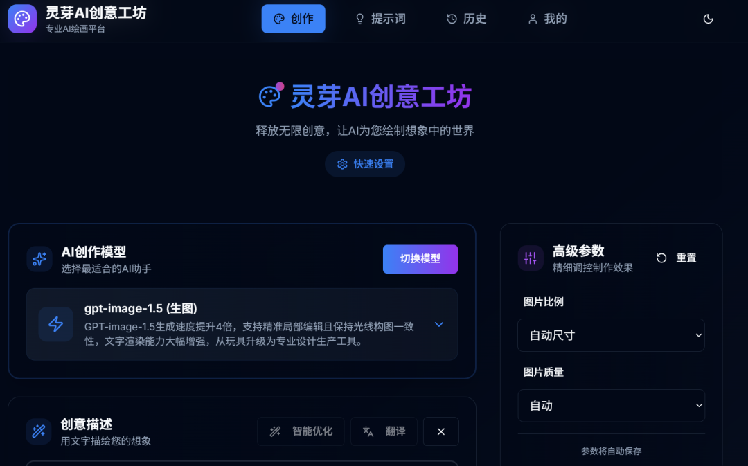 - • Deep-Prompt 中文增强引擎:这是一个针对国内用户的杀手级功能。系统内置了一个微调过的 LLM 中间层,当用户输入简单的中文(如“画个大气的海报”)时,它会自动将其扩写为包含光效(Global Illumination)、材质(Matte finish)、构图(Rule of thirds)等专业术语的英文 Prompt,再发送给底层模型。这使得小白用户也能生成专家级图片。