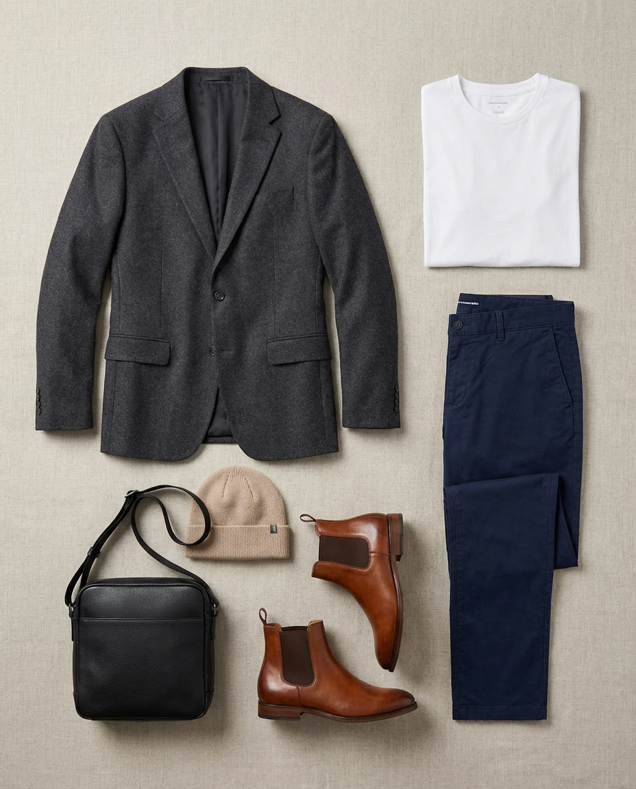 - • 实测表现:AI成功将5件单品“穿”在了模特身上。难点在于层级关系处理(如外套压在内搭上,包带压在肩膀上),模型处理得非常自然,且调整了衣物的褶皱以贴合人体姿态。