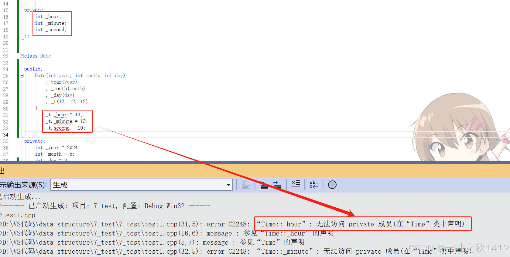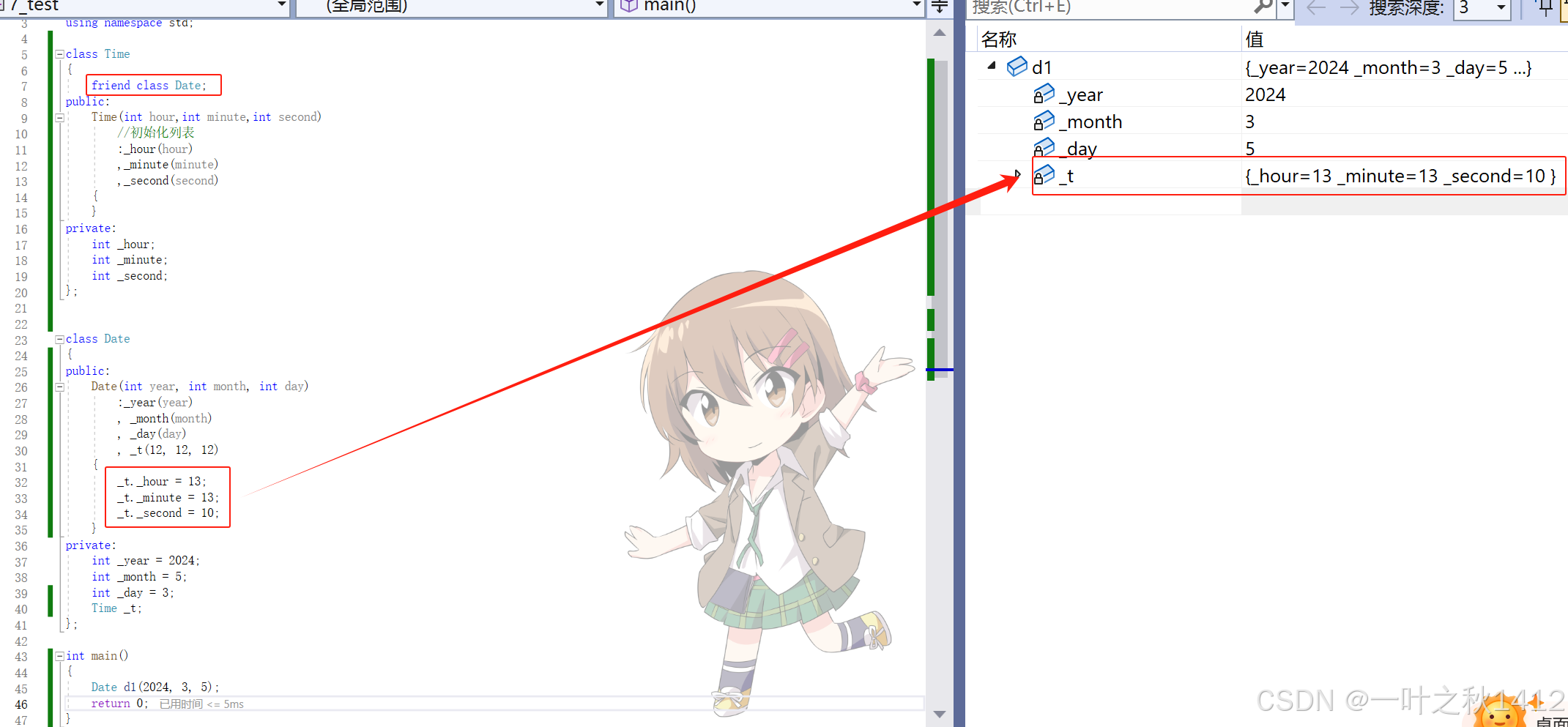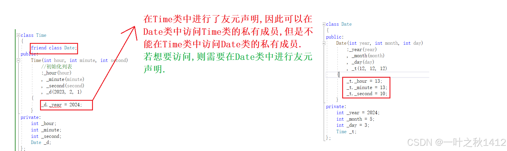 通过观察,我们可以清晰地看到,当未进行友元声明时,此时无法在Date类里面访问Time类的私有成员变量.
