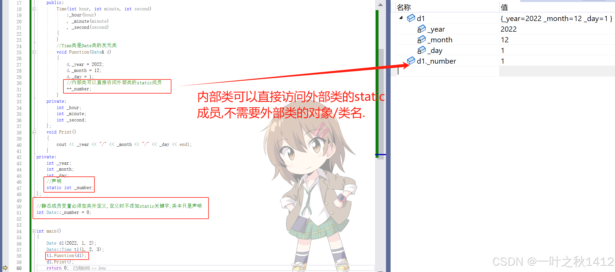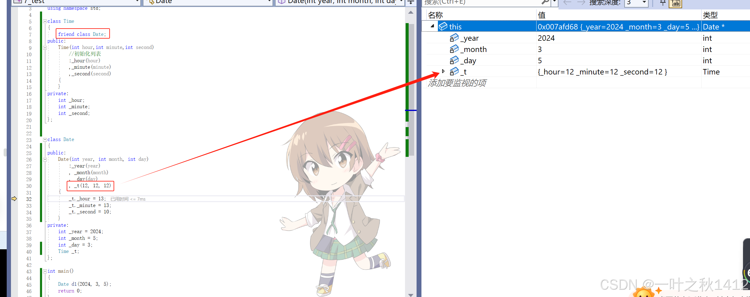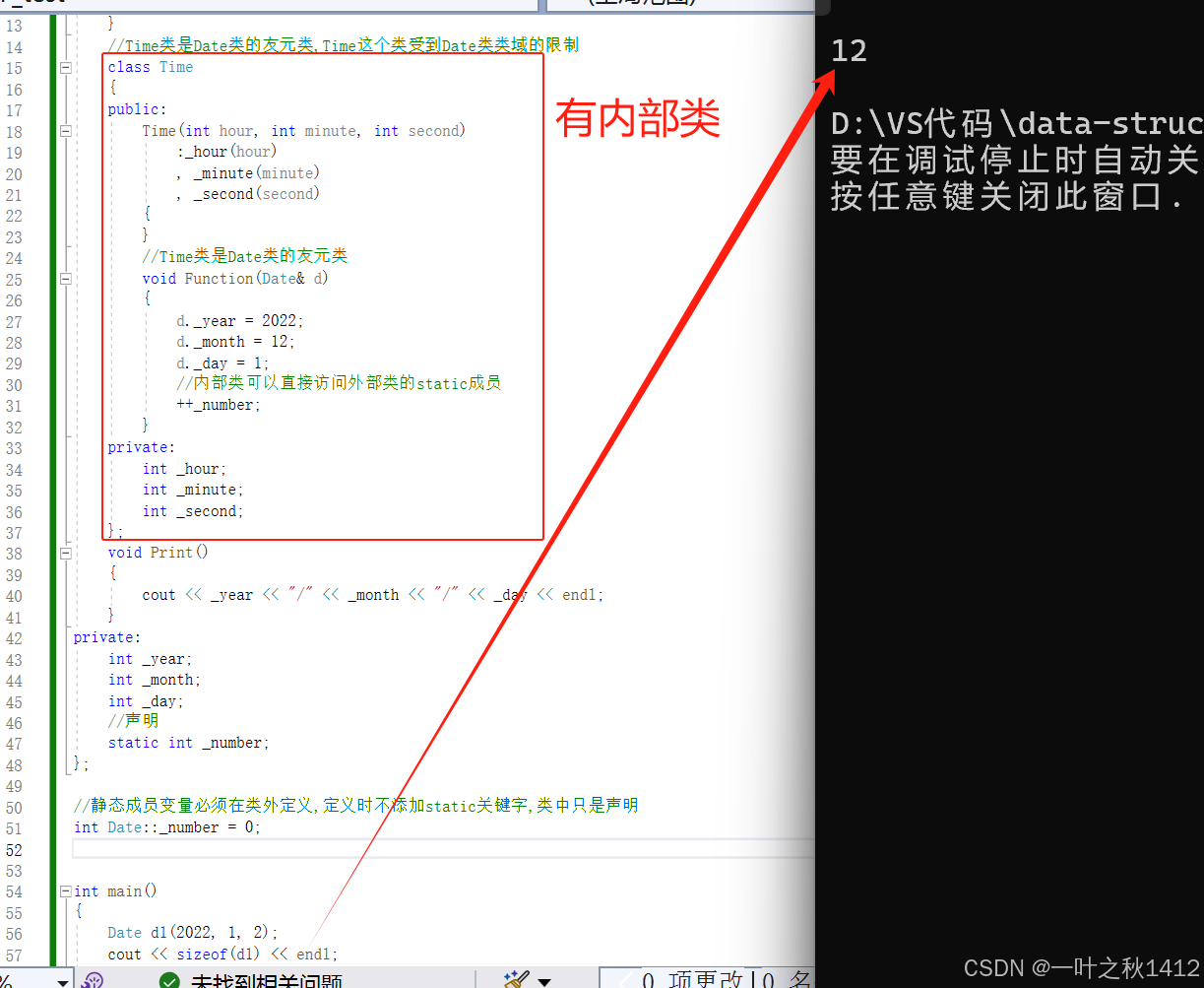 通过观察,我们可以清晰地看到,当未进行友元声明时,此时无法在Date类里面访问Time类的私有成员变量.